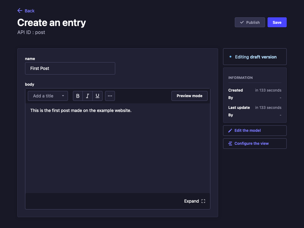 Example Siteand for description field, it usesWelcome to your example website, featuring content from Strapi!.Click Save from the upper right to save the changes you have made. Then, click Publish from the upper right to move the entry from Draft to Published status.