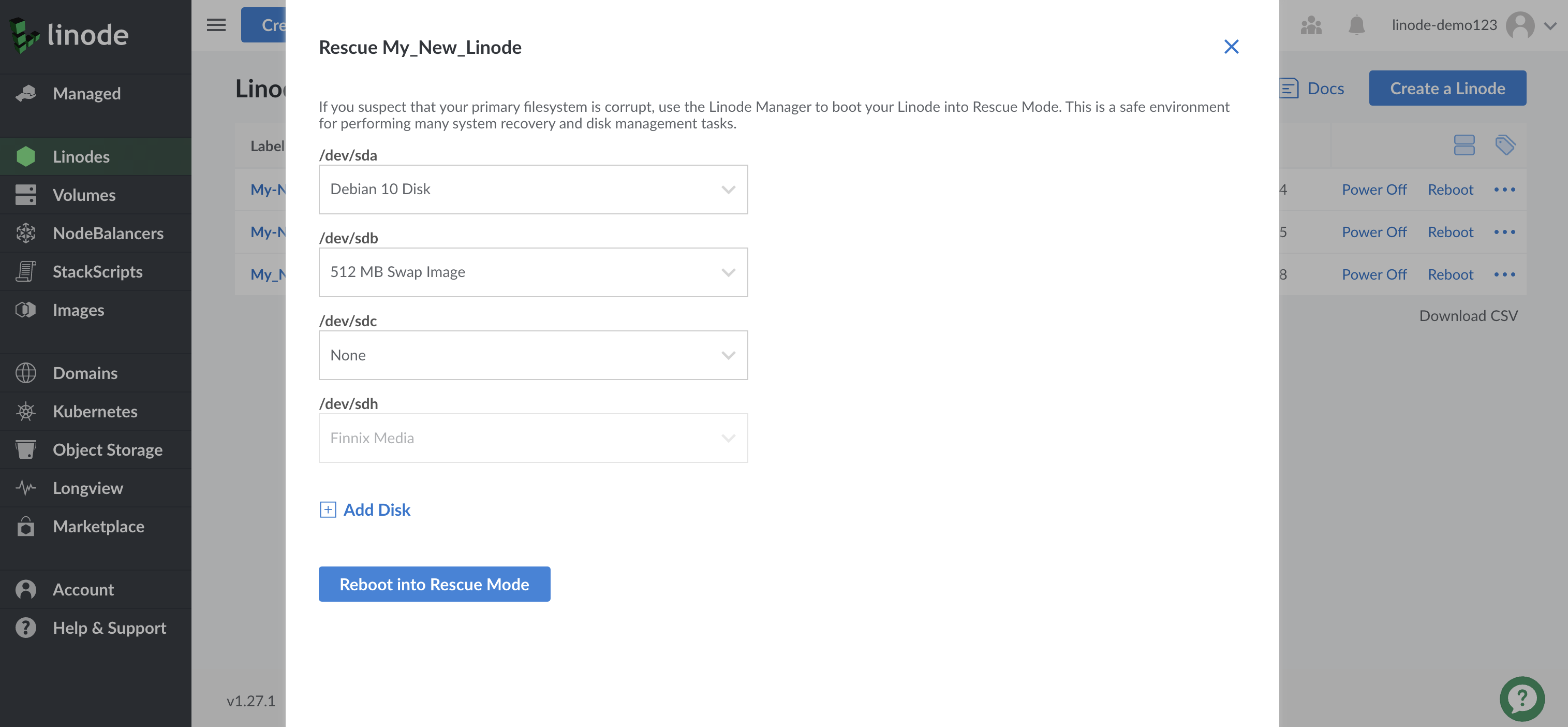 Note Make a note of which devices the disks are assigned to (e.g./dev/sda,/dev/sdb, etc). For example, in the screenshot shown above, the Ubuntu disk corresponds to/dev/sda. These assignments are where you can mount the disks from inside Rescue Mode.If you need to assign additional disks to be accessible inside Rescue Mode, click the Add Disk option: